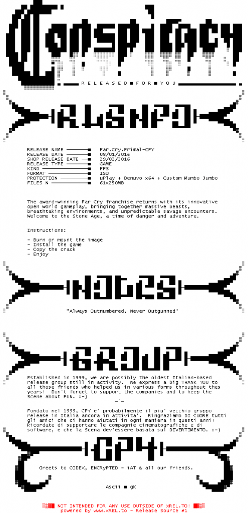 Walaupun keberhasilan CPY kali ini berkat kerjasama dengan grup pembobol lain, tetap saja kenyataannya sama. Far Cry: Primal dengan Denuvo telah berhasil di tembus. CPY juga merilis NFO untuk game tersebut: