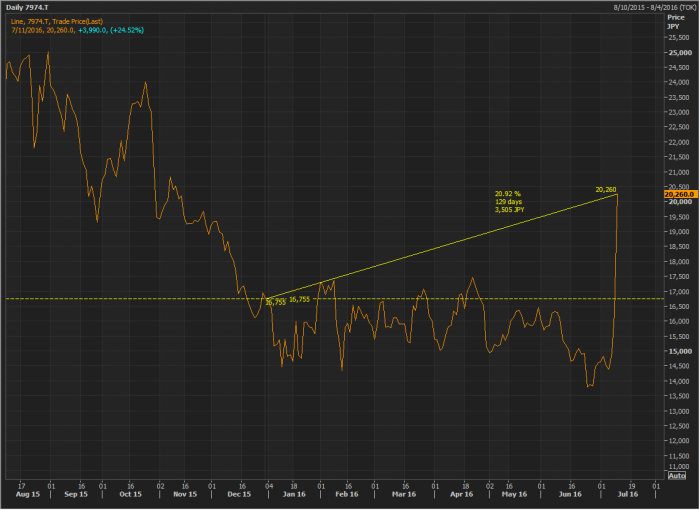 Beberapa hari setelah Pokemon Go dirilis, Nintendo mendapatkan perhatian khusus dari berbagai kalangan karena di anggap menghadirkan pengalaman baru dalam Dunia game. Akhirnya Saham Nintendo sebagai pemilik lisensi Pokemon Naik, Tidak tanggung-tangung harga saham Nintendo Naik 25% dalam waktu 2 hari saja. Coba lihat Grafik di berikut ini: