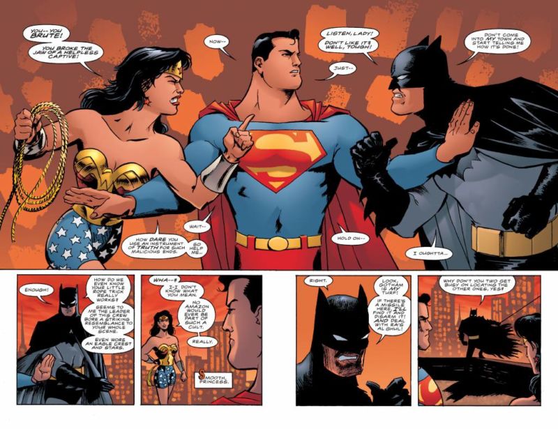 Mereka bekerja sama sebagai trio untuk mengalahkan Doomsday. Dalam komik, gaya heroik Batman sering bertentangan dengan Superman, Wonder Woman, dan rekan-rekannya yang lain.