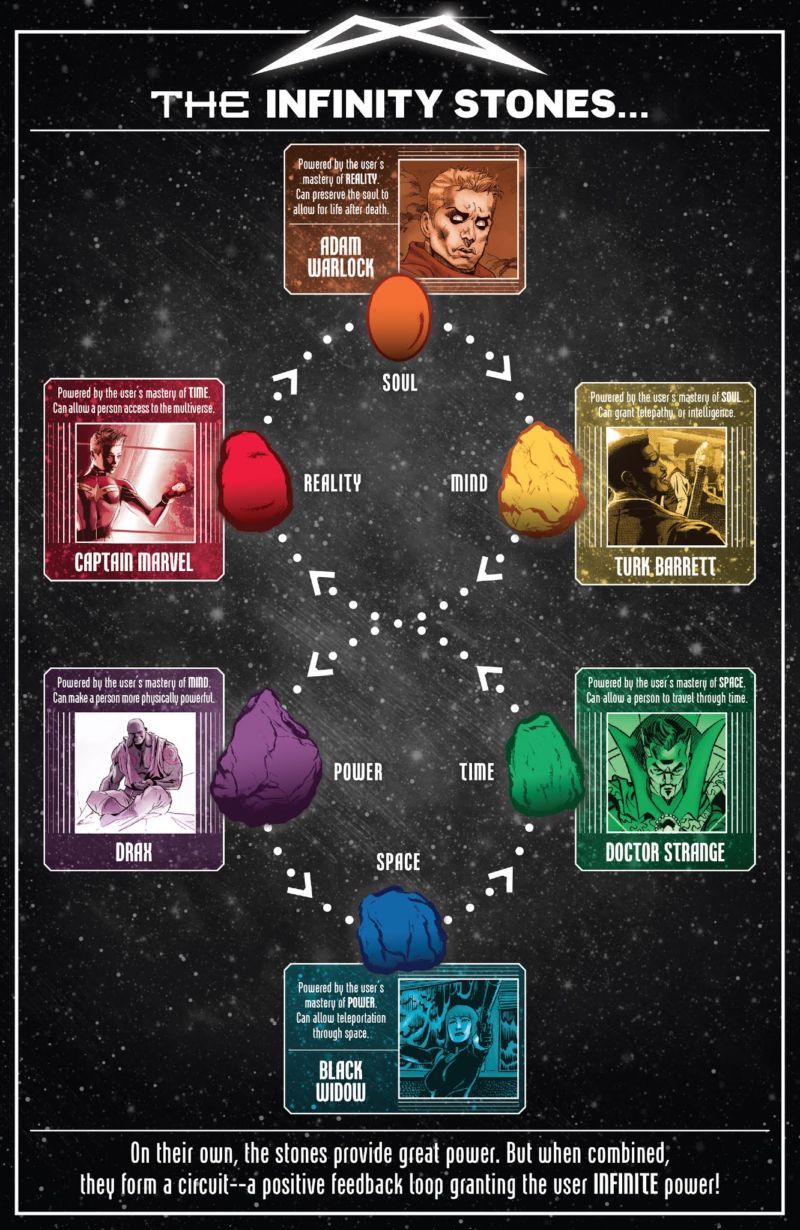 Dalam Infinity Wars # 1, Infinity Stone sekarang di jaga oleh penjaga yang baru seperti Doctor Strange, Captain Marvel, Star-Lord, Adam Warlock, Turk Barrett, dan Black Widow.