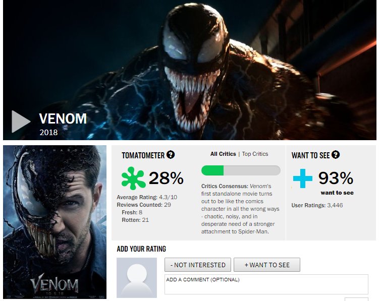 Nah oleh sebab itu, kami pun mengecek ratingnya di Rotten Tomatoes. Biasanya sih, film Marvel memiliki nilai yang tinggi jika dikritisi oleh RT. Tapi sayangnya, Venom tidak mendapatkan nasib yang sama dari temannya yang lain.