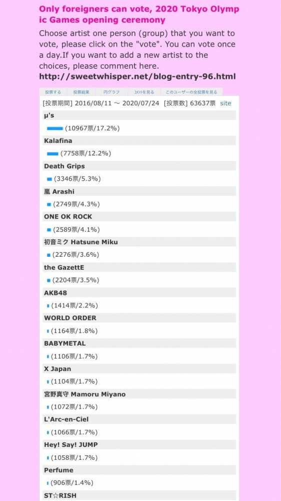 Ternyata µ’s sukses menjadi grup paling diinginkan tampil di Olimpiade Tokyo 2020. Dengan disparitas yang besar dari peringkat kedua, Kalafina. Sepertinya banyak yang berharap grup idol tersebut dapat mewakili Jepang di panggung bergengsi tersebut. Bahkan Hatsune Miku, dan AKB48 berada jauh di bawah µ’s.