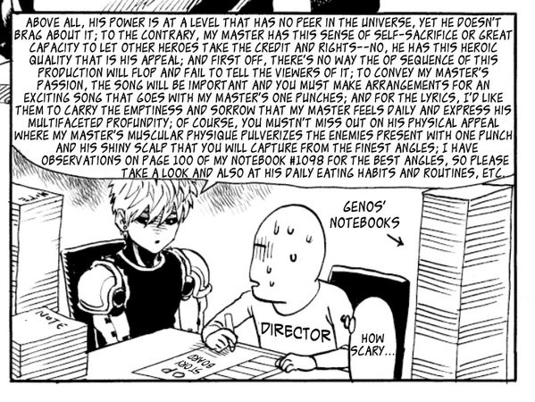 Bahkan dia memaksa Sang Director untuk menganimasi kan saitama sesuai dengan deskripsi panjangnya bahkan membuat Notebook panjang untuk bisa di mengerti oleh director.