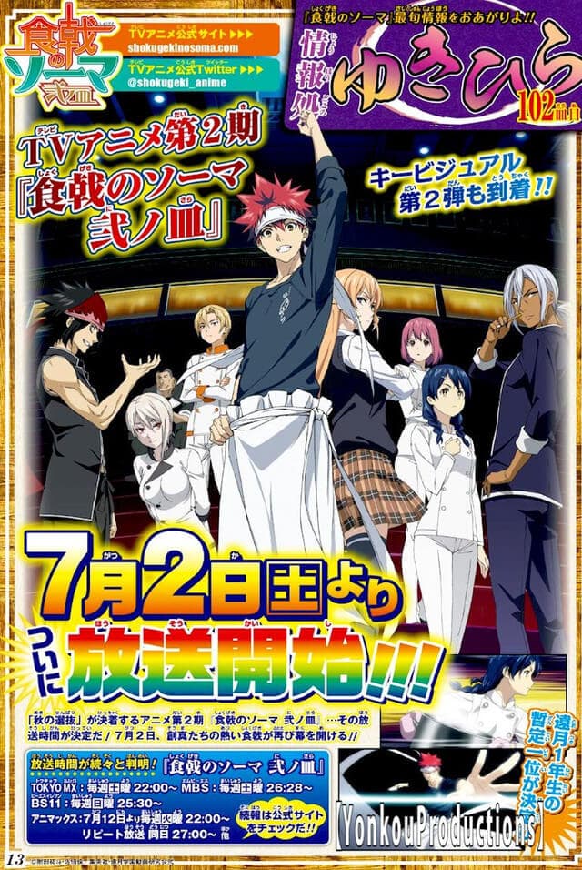 Melalui cuplikan gambar majalah Shonen Jump yang akan dirilis minggu depan, Shokugeki no Soma Season 2 telah di umumkan akan ditayangkan pada tanggal 2 Juli mendatang. Season Kedua Anime itu akan mengulas lanjutan Autumm Selection Tournament di babak 8 Besar peserta.