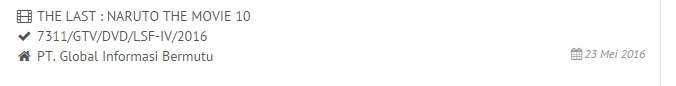sayangnya, tidak semua wilayah di Indonesia punya Bioskop dan salah satunya adalah penulis yang tinggal di pinggiran Indonesia ini. dan Akhirnya, bagi kamu yang belum sempat menonton The Last: Naruto The Movie bisa bernafas lega. Karena berdasarkan data Lembaga Sensor film Indonesia, The last: Naruto The Movie telah lulus Sensor dan siap tayang di Global TV yang di kelola PT. Global Informasi Bermutu.