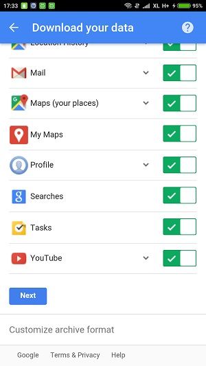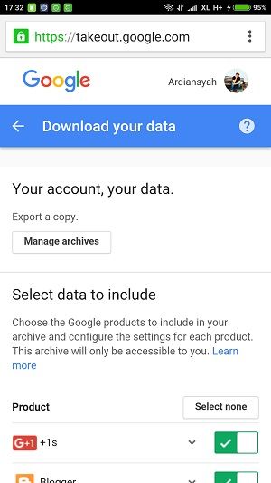 - Sekarang dimana proses untuk memilih layanan yang ingin kamu unduh pada bagian Select data to include. Disini bagian layanan aktif secara default, namun kamu bisa memilih layanan apa saja untuk di unduh dengan mengubah posisi di toggle.