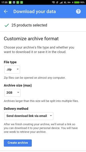 - Sekarang pilih tipe data yang ingin di download melalui Costumize archive format. Saran DafundaTekno memilih tipe data dengan format .zip sehingga kamu bisa membukanya pada jenis komputer umumnya. Pada bagian bawah sudah tertera ukuran data arsip paling besar adalah 2 GB. Jika kamu merasa kurang, kamu dapat memilih ukuran lainnya.