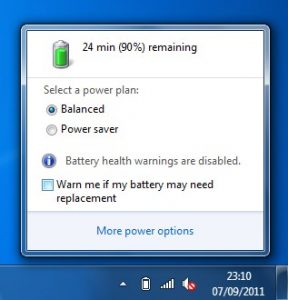 Pada Windows 7 SP1 sudah tersedia menu untuk mematikan notifikasi peringatan baterai ini. Caranya tinggal klik pada icon baterai lalu hilangkan centang “Warn me if my battery may need replacement”. Maka tanda silang pada baterai tadi akan hilang dan tidak mengganggu kamu lagi.