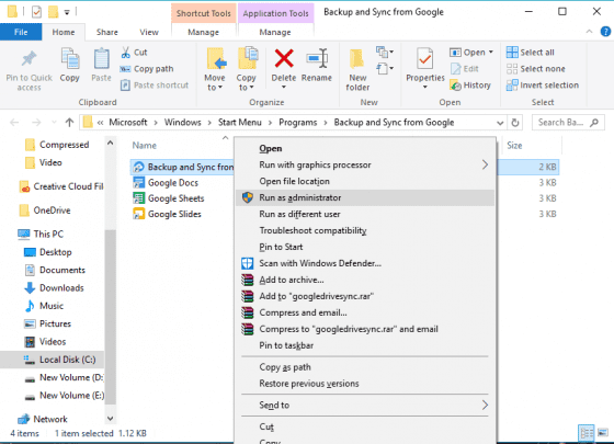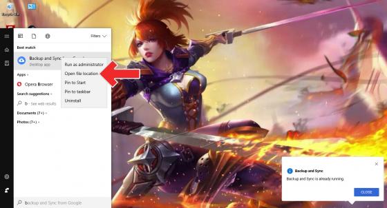 - Buka Start menu lalu ketikan Google Drive atau Backup and Sync, klik kanan kemudian pilih Open file location.