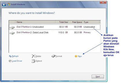 - Sekarang kita akan membuat partisi baru yang akan diisikan dengan Windows 7, caranya Klik New kamudain OK.