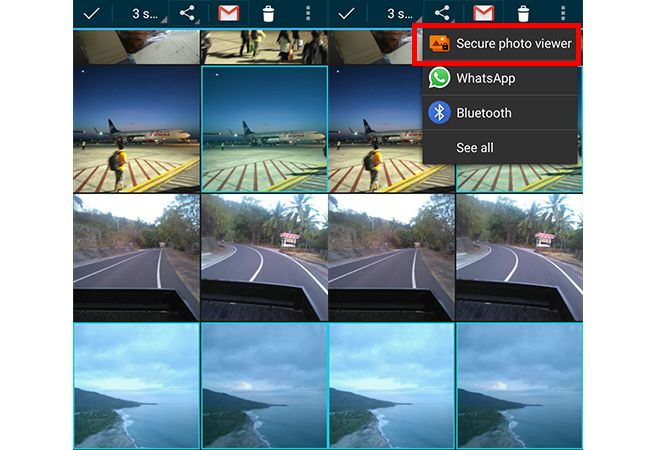 - Tandai Foto dan video yang ingin kamu tunjukkan ke teman kamu, kemudian pilih ikon share berlogo huruf V miring kekanan, lalu pilih aplikasi Secure Photo Viewer.