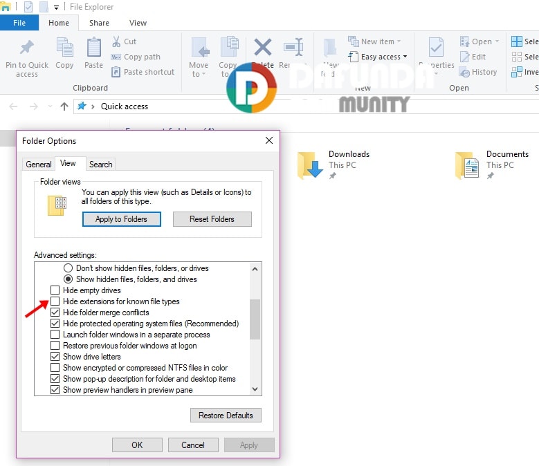 - Pada jendela Folder Options, pilih tab View lalu hilangkan centang pada opsi Hide extensions for known file types, kemudian Apply.
