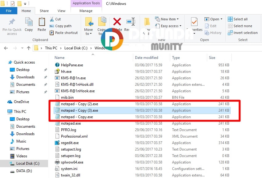 - Langkah selanjutnya buka partisi C:\Windows – arahkan scroll sampai kebawah dan temukan notepad.exe – copy notepad.exe lalu paste sebanyak 3 kali, sehingga kamu akan melihat 3 buah file baru yakni: