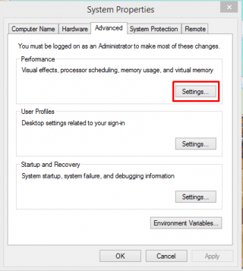 - Langkah awal, buka System Properties, kemudian menuju ke tab Advance lalu pilih Performance.