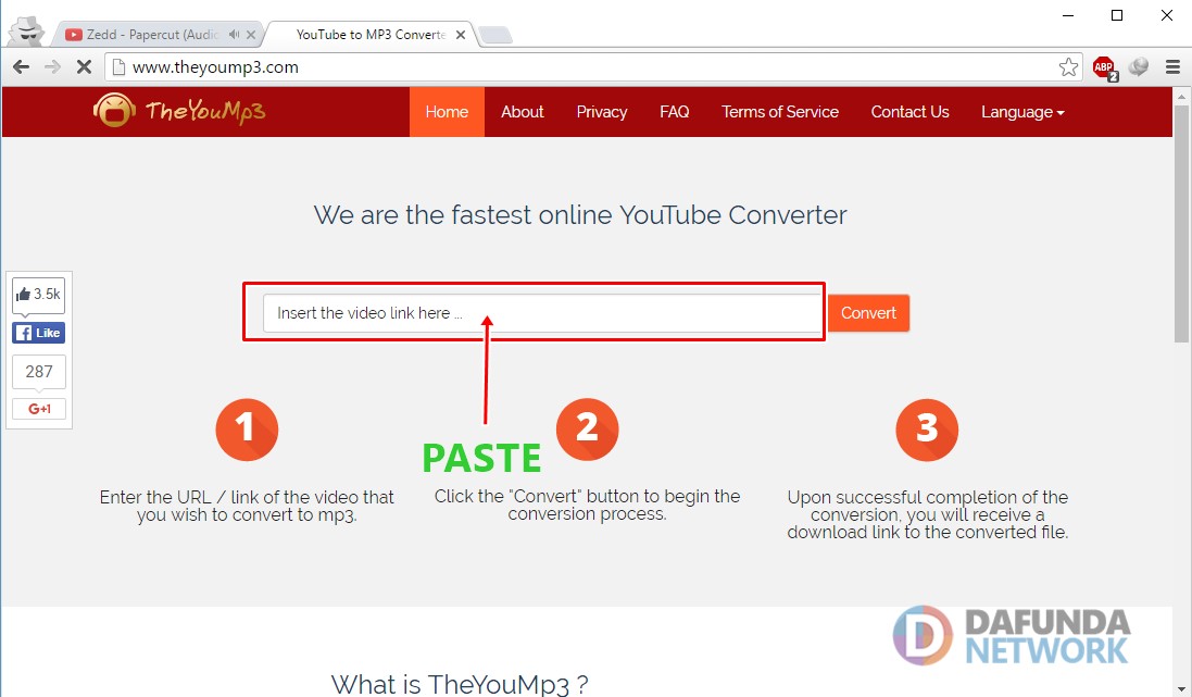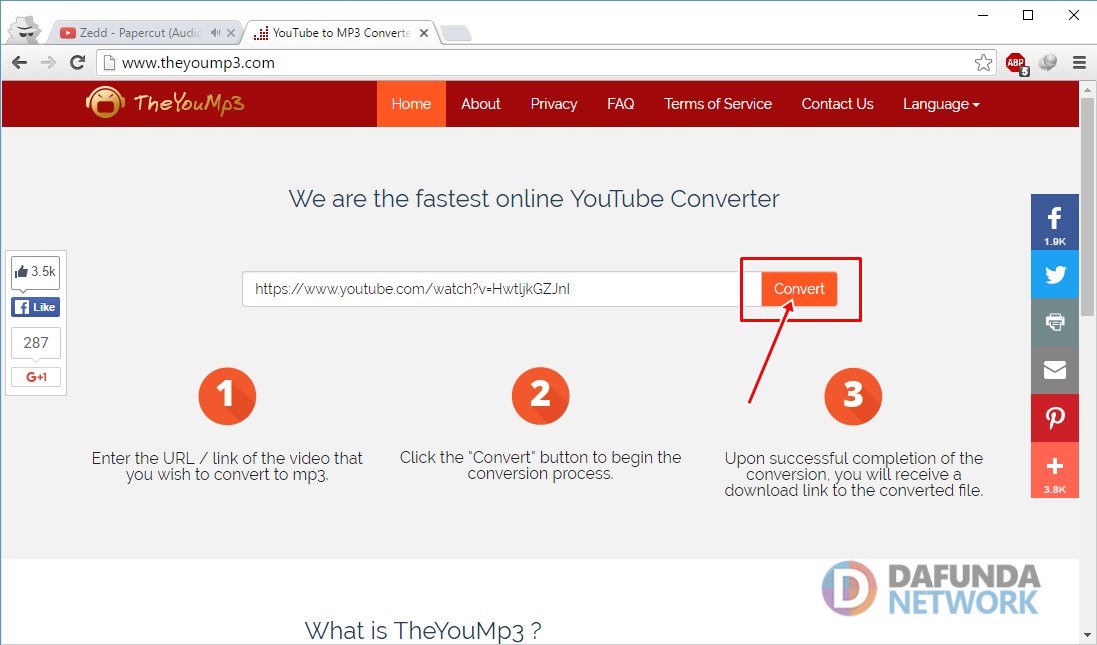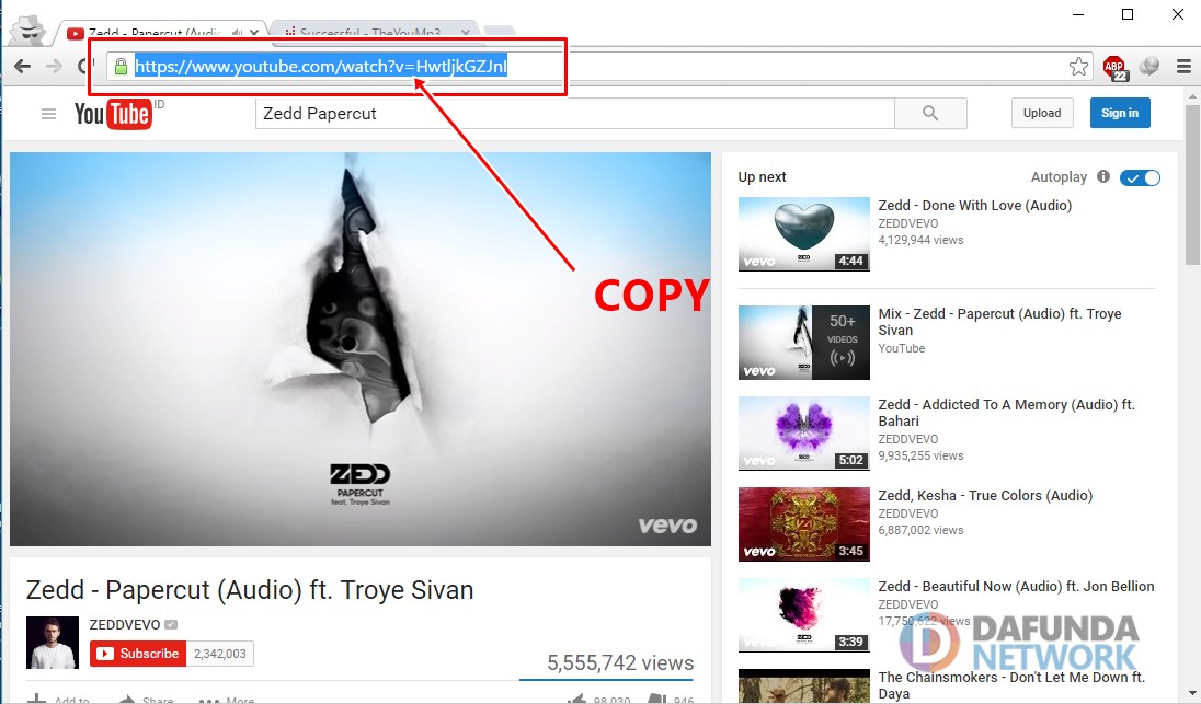 - Cari Lagu yang ingin kamu download di Youtube, Disini Dafunda Tekno memilih Zedd – Papercut. Lihat di bagian Alamat url lalu blok semuanya dan pilih Copy