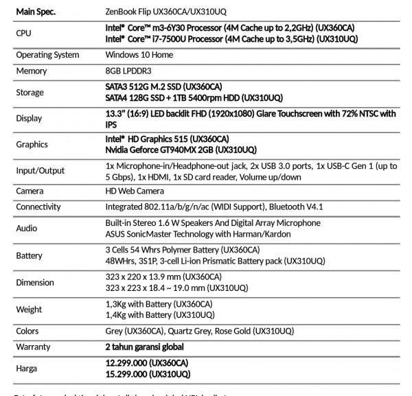 Dari kedua varian ultrabook convertible ASUS ZenBook Flip UX310UQ dan ultrabook ASUS ZenBook UX360CA, ASUS memberikan bonus angpao spesial hingga Rp 2 juta. Dari harga sebelumnya untuk ultrabook ASUS ZenBook UX310UQ dibandrol 15.799.000 sekarang menjadi Rp 15.299.000. Sedangkan untuk ultrabook ASUS ZenBook UX360CA dibandrol menjadi Rp 12.299.000 dari sebelumnya Rp 14.299.000.