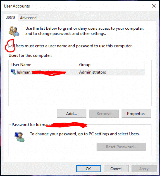 - Sekarang hilangkan centang “Users must enter a user name and password to use this computer” pada akun yang sedang kamu gunakan, lalu klik Apply.