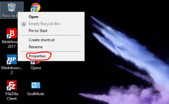 - Klik kanan pada “Recyle Bin” lalu pilih “Properties”.