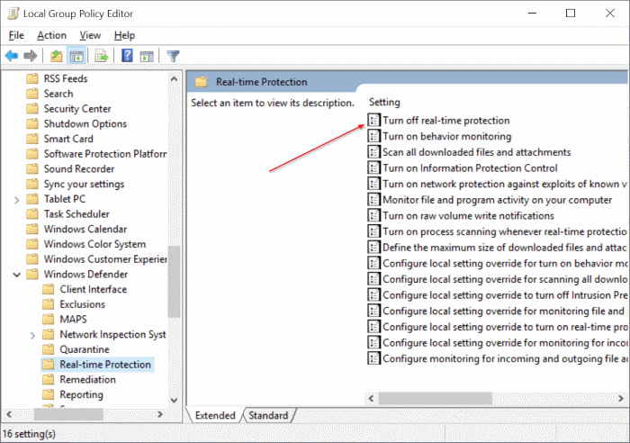 - Sekarang arahkan ke direktori Configuration > Administrative Templates > Windows Components > Windows Defender > Real-time Protection.