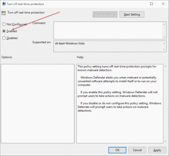 Ingat: Bagi kamu yang ingin mengaktifkan kembali fitur real-time protection. pilihlah opsi Not Configured lalu klik tombol Apply.