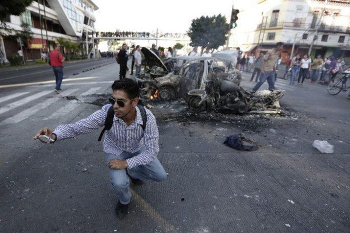 4. Pria ini selfie dengan latar belakang kendaraan terbakar