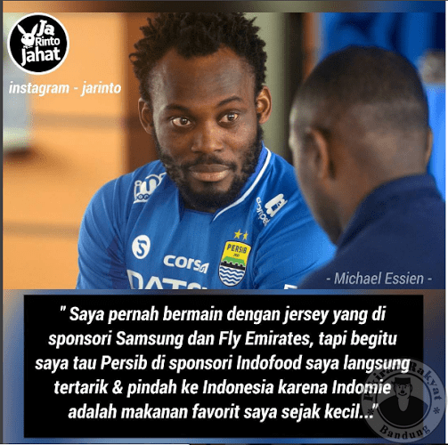 Kang Essien bilang “saya pernah bermain dengan jersey yang disponsori Samsung dan Fly Emirates, tapi begitu saya tau Persib di Sponsori Indofood saya langsung tertarik & pindah ke Indonesia. Karena Indomie adalah Makanan Favorit saya sejak kecil …” mantap kang.